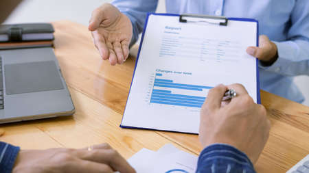 Finance staff are presenting financial information to finance managers by documenting charts, providing financial information to plan and develop the company's finances to grow. Financial concept.