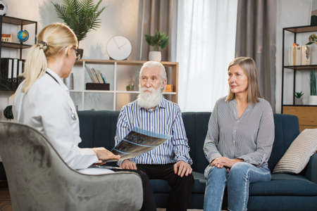 Retired couple sitting on the sofa at home and listening to their gp doctor. Young high-skilled female healthcare worker, holding CT x-ray scan, consulting joyful senior couple during home visit.