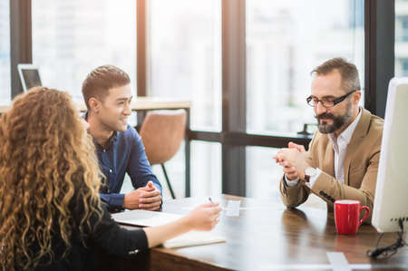 Group of architects sitting at the table and discussing project they having a meeting at office
