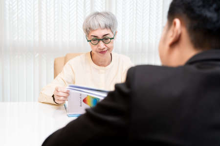 male job applicant Asians are Interview with an elderly Asian woman manager in an office in a friendly atmosphere. The interviewees were very satisfied with the qualifications of the job applicants.