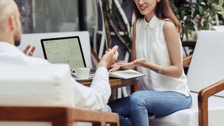 Side view of female workers consulting on their work with smartphone and laptop in minimal office room