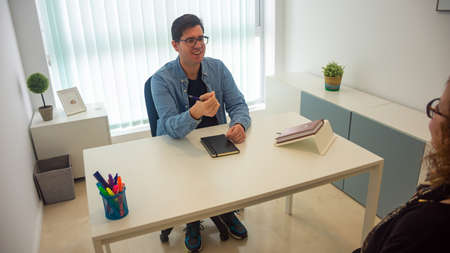 Speech therapist attending to a patient in her office. In the office you see a white table, an agenda and stationery.