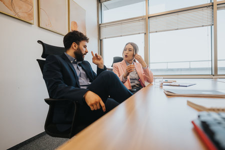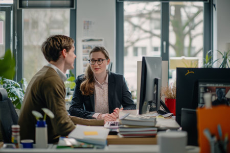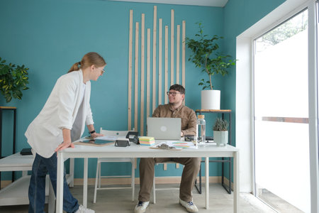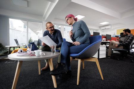 Two businesspeople collaborate in a modern office space, discussing documents and ideas during a productive work session in a creative environment