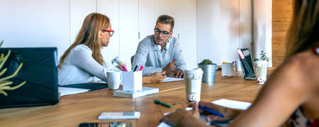 Beautiful business people are using gadgets, talking and smiling during the conference in office