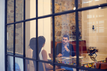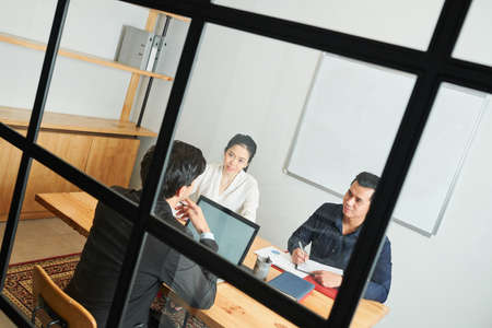 Business partners sitting at the table talking to their male leader while have a business meeting at board room behind the glass wall at office