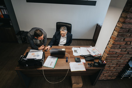 Positive confident business partners ending meeting with handshake, in office and discussing collaboration. High angle. Communication or partnership concept
