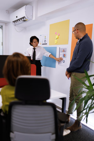 asian woman gesturing while talking to multiethnic business partners at workplace