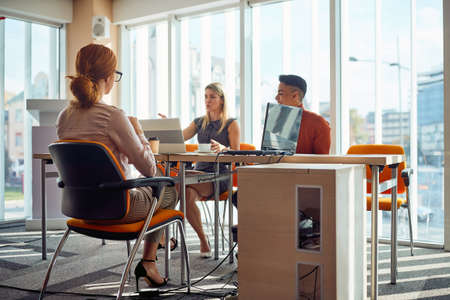 Teamwork of successful business content writers, talking about work, using laptop computer. Students learning online in university library. CEO having interview with new employees sitting in office