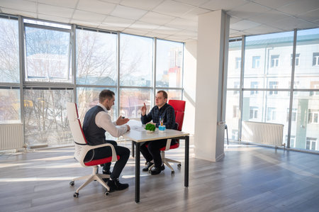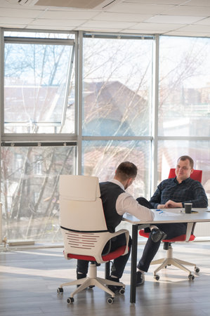 In a contemporary office, two senior executives with a mission to brainstorm and monitor the progress of a business project