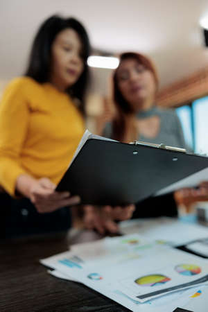 Manager woman holding clipboard analyzing management statistics with entrepreneur worker working at company strategy during business meeting in startup office. Team brainstorming ideas