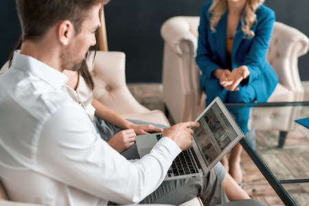 Young couple visiting travel agency, sitting on sofa, looking at laptop screen and choosing resort while planning vacation with female manager