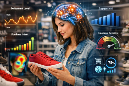 Woman holds red sneakers while looking at them in a store. Charts display her excitement, engagement, and purchase intent.