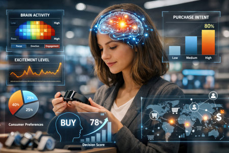 A woman studies smart gadgets in a technology store while data about brain activity and consumer preferences is displayed on screens.