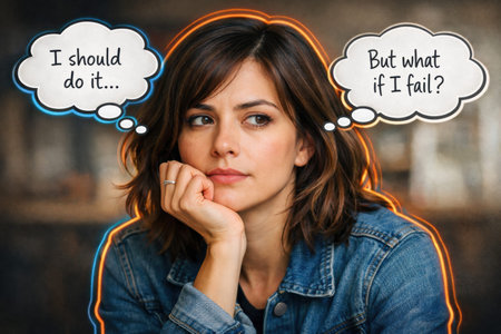 A woman sits indoors, deep in thought. She considers taking action while worrying about possible failure.