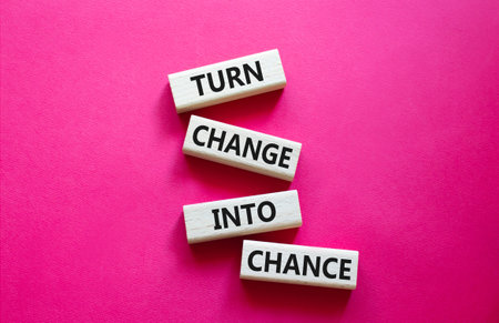 Change and Chance symbol. Concept words Turn Change Into Chance on wooden blocks. Beautiful bright red background. Business and Turn Change Into Chance concept. Copy space.