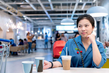 beautiful asian woman casual dress sit wait relax with coffee drink in cafe background