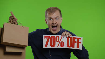 Great discounts. Happy man in shirt showing discount percent advertisement inscriptions, bags and shouting from joy, enjoying shopping with low prices on Black Friday. Chroma key. 6k downscale