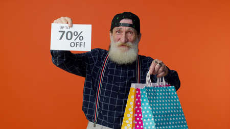 Senior bearded man showing shopping bags and Up To 70 Percent Off inscriptions banner text. Black Friday. Good holiday discounts, low prices for shopping. Elderly old grandfather on orange background