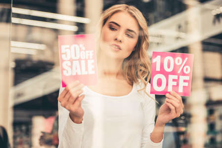Beautiful sales assistant is putting on the shop window an announcement about sales and smiling