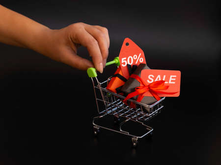 The hand holds a small shopping cart filled with discounts and gifts, a layout with copy space, the concept of sales.