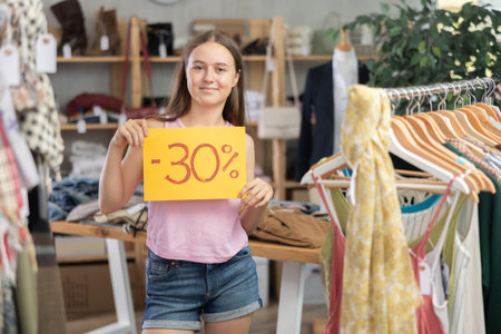 Hands of female shopper choosing second hand clothes with red discount tag offered for sale at thrift store, copy space