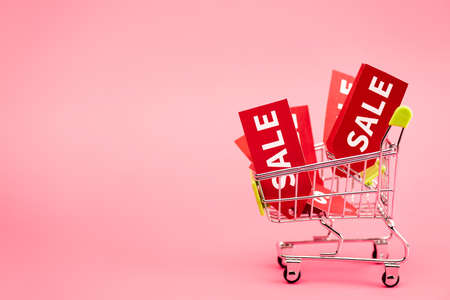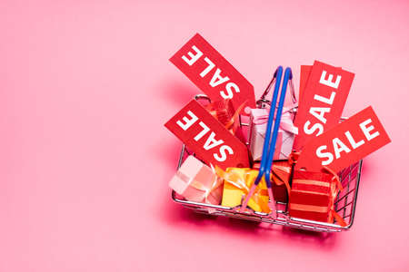panoramic crop of sale tags near shopping basket on pink, black friday concept