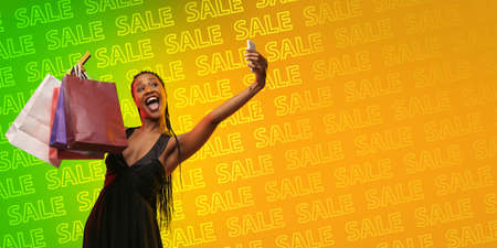 Selfie with bags. Portrait of young beautiful woman in neon light on gradient studio backgound. Neoned lettering SALE. Human emotions, black friday, cyber monday, purchases, sales, finance. Copyspace.