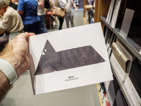 holding new Apple Computers Smart Keyboard for iPad magnetic typing control mechanism defocused customers in background