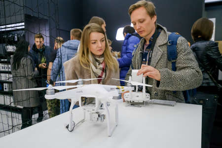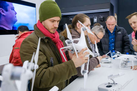 Moscow, Russia - April 1, 2017: Customers watch quadrocopters at the opening of DJI Authorized Store