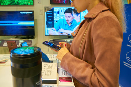 MOSCOS, RUSSIA - SEPTEMBER 20, 2018: woman hold smartphone at Samsung store in Moscow.