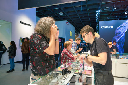 COLOGNE, GERMANY - CIRCA SEPTEMBER, 2018: model posing at Panasonic stand at the Photokina Exhibition. Photokina is a leading trade fair for the worldwide photo industry.