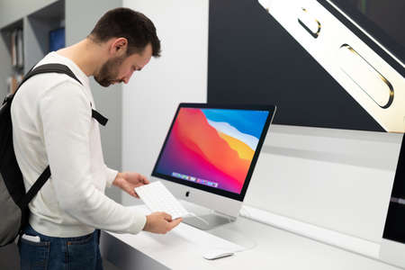 Photo of young handsome brunet man with stubble in a white sweatshirt chooses a computer monitor and keyboard in an electronic store in a shopping mall. Smartphone shop concept.