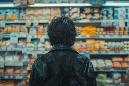 Young beautiful person deciding on groceries choosing food in convenience store organic meal healthy eating habits supermarket market customer looking for a lunch