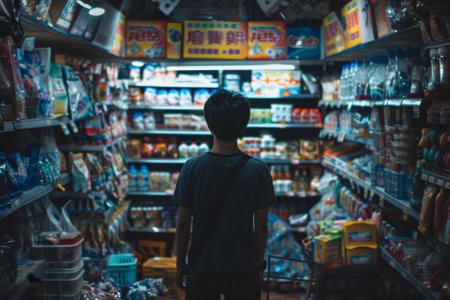 A man is browsing products on shelves at a retail store in the city, looking for items to purchase. The convenience store is selling various goods to customers