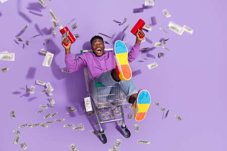 Full body photo of amazed excited handsome guy sit trolley shoot usd banknotes isolated on purple color background