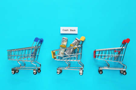 Card with word Cashback, rolled dollar banknotes and shopping carts on light blue background, flat lay