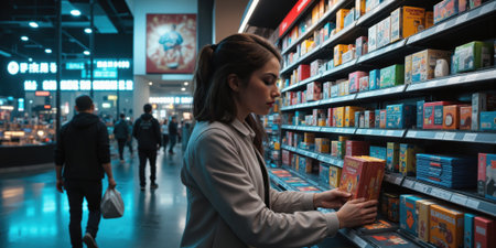 Young beautiful person deciding on groceries choosing food in convenience store organic meal healthy eating habits supermarket market customer looking for a lunch