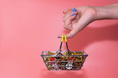 christmas toys in a supermarket basket in a womans hand on a pink background