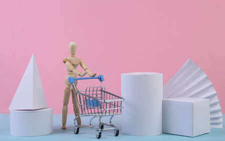 Wooden puppet with Shopping trolley and geometric shapes on blue pink pastel background. sale, product presentation. Abstract background, concept art