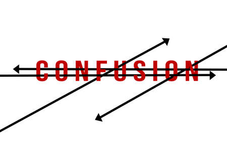 Confusion text concept banner . Arrows through the text. Choose the right path concept.