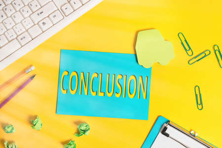 Text sign showing Conclusion. Business photo text used at the end of a speech of writing to make final comments Flat lay above empty paper with copy space and colored paper clips