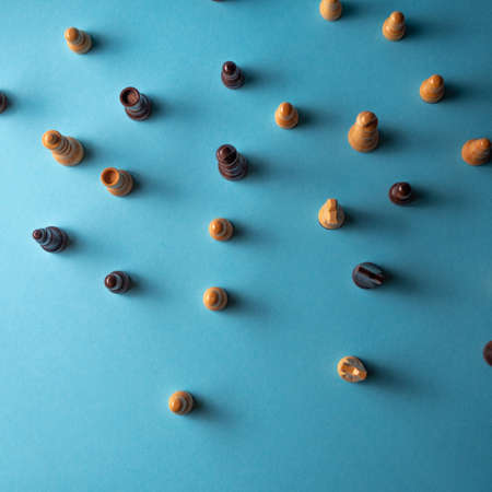 Pieces of XO game, abstract composition, multiple x pieces against o piece, simulation of conflict.