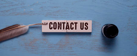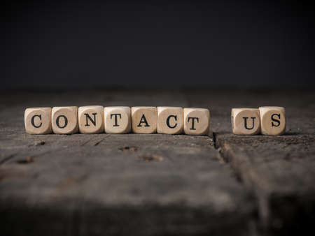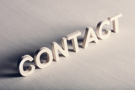 CONTACT writing made from white letters on wooden background. Support center, customer service, consumer help.
