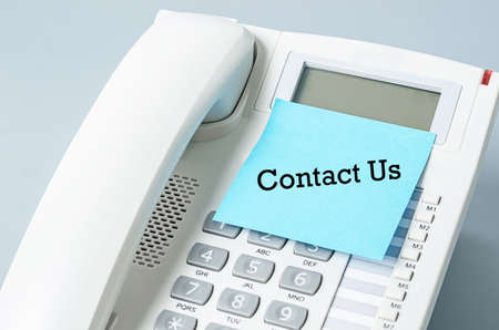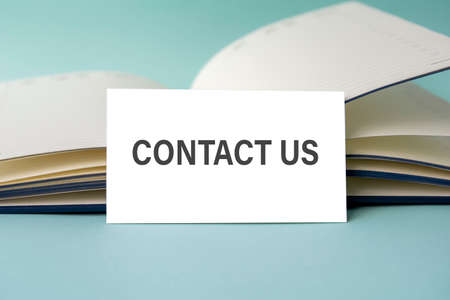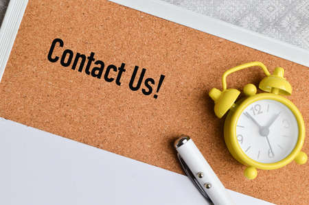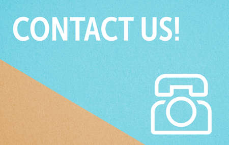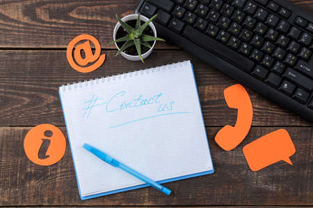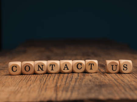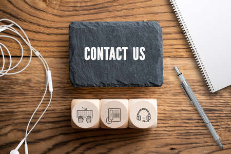 slate plate with message contact us and cubes with contact option icons on wooden background