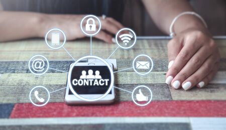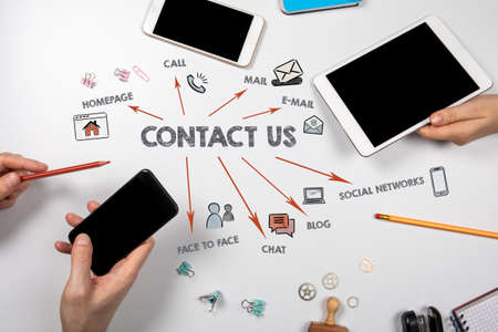 Contact Us business concept. Homepage, e-mail and social networks. Meeting table with various mobile devices