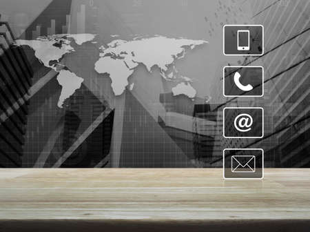 Telephone, mobile phone, at and email buttons on wooden table over world map with financial graph and city tower, Customer support concept