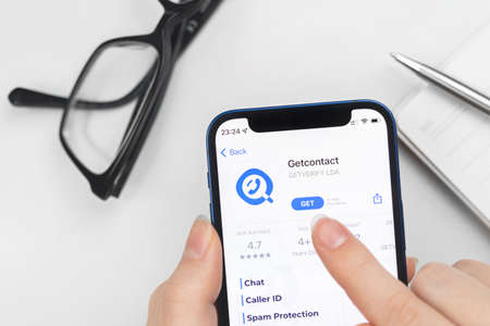 Kharkov, Ukraine - January 10, 2022: Getcontact app icon closeup. Woman uses the application on Apple iPhone 12