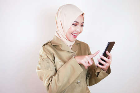 Smiling government worker showing blank screen on a smartphone. A young Asian Muslim PNS wearing khaki uniform and hijab.