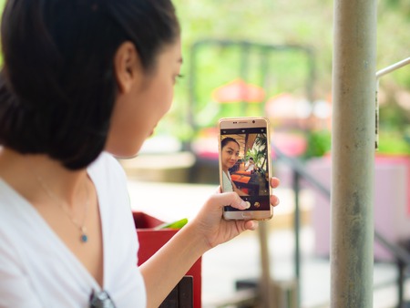 Happy two young attractive asian girls take a selfie at the park