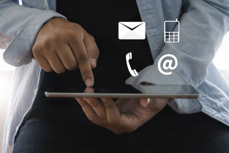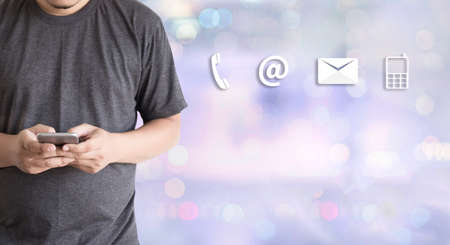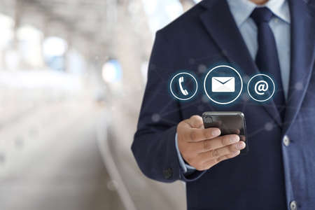 Contact us or Customer support hotline people connect. Businessman using a mobile phone with the (email, call phone, mail) icons.